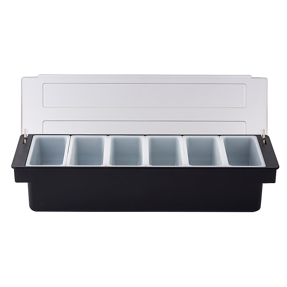 This bar condiment holder includes a clear cover that allows bartenders to quickly identify condiments inside the caddy