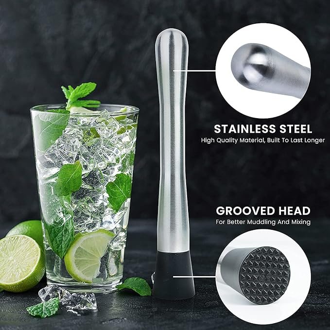 Stainless Steel Muddler, Long Mallet for Crushing Ice, Grooved Head for Mixing Fruit